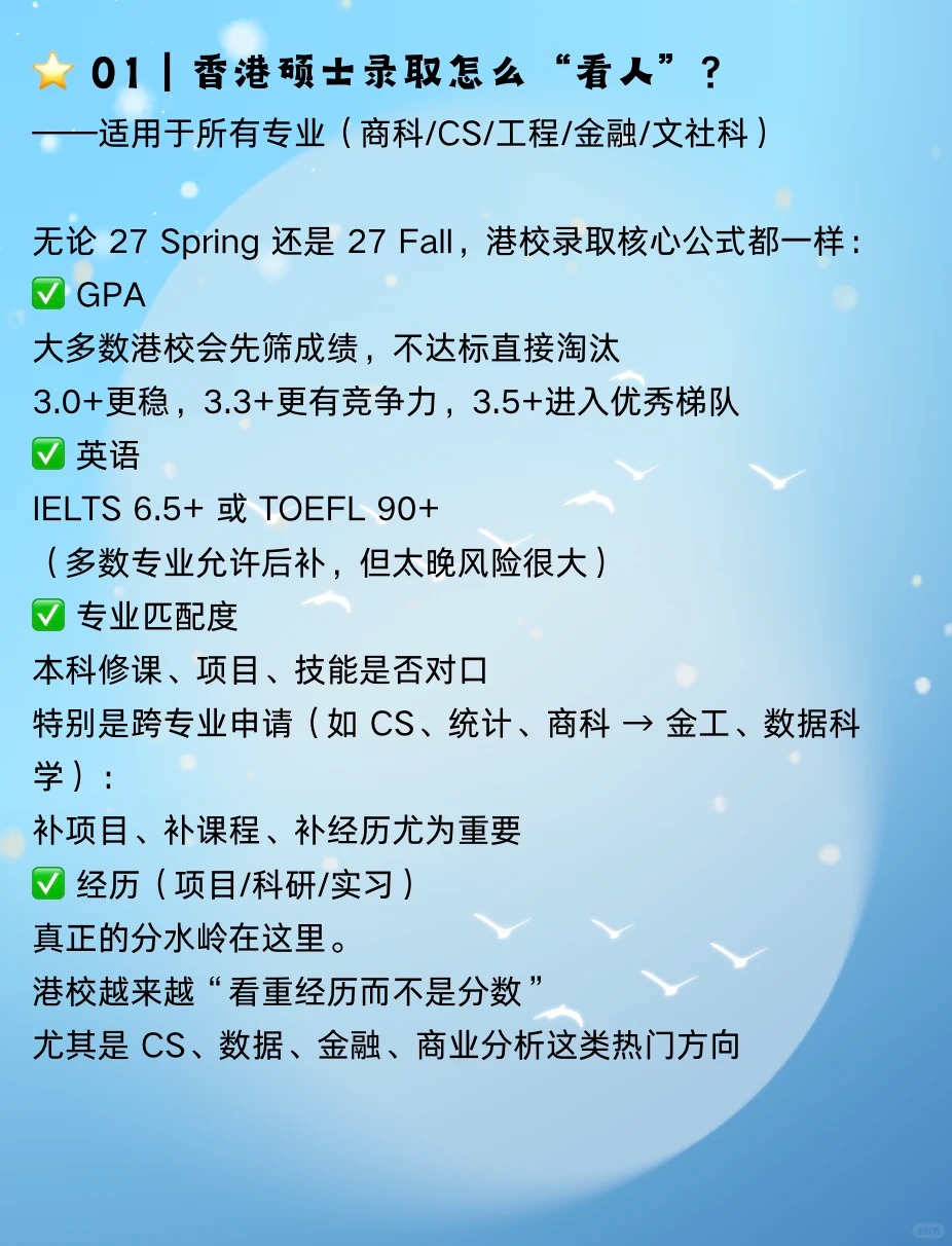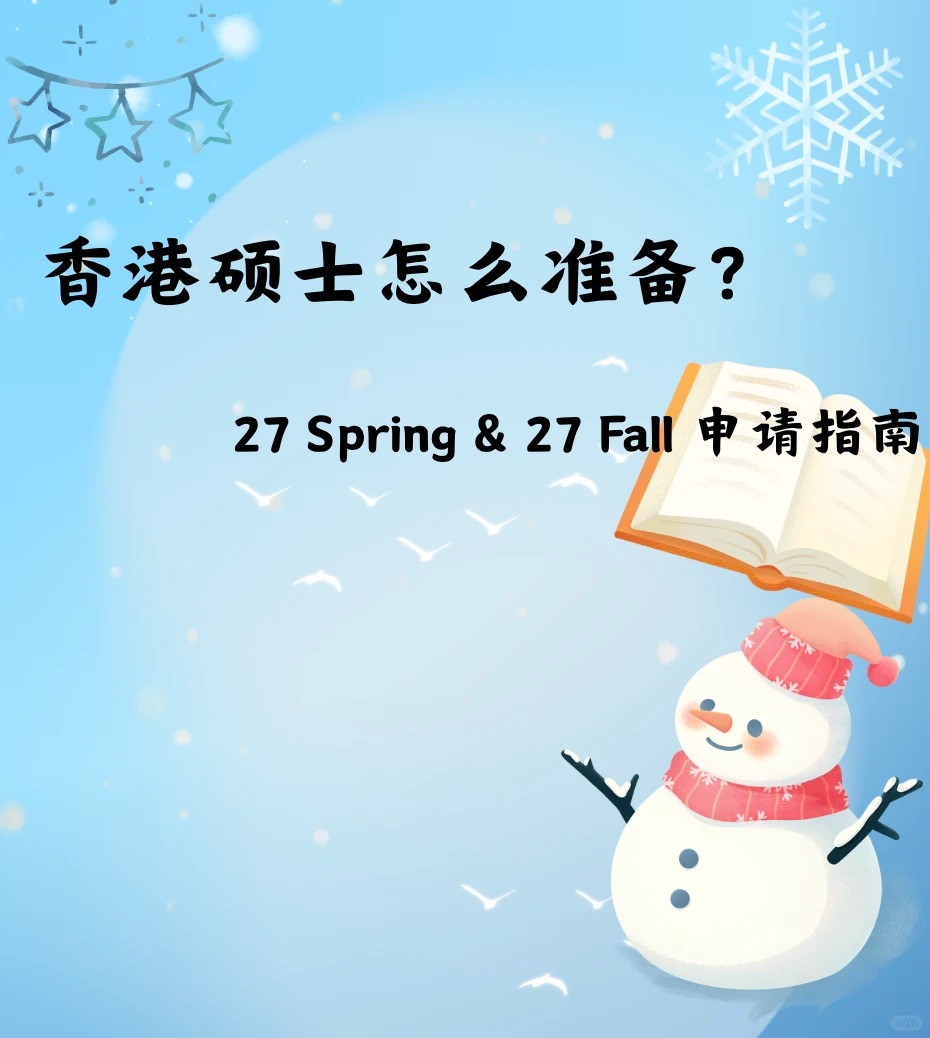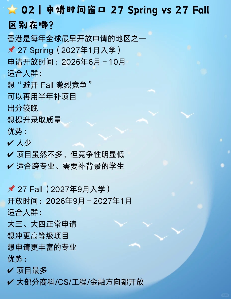 ?【27 Spring & 27 Fall 申请指南|香港硕士怎么准备?大陆本科的同学要提前准备什么?】 如果您打算让孩子申请香港硕士,请记住一句话: 香港硕士不是最后一年才准备,而是提前一年布局 错过准备时间=错过第一轮录取=录取质量大幅下降 ⭐ 01|香港硕士录取怎么“看人” 无论 27 Spring 还是 27 Fall,港校录取核心公式都一样 ✅GPA 3.0+稳,3.3+更有竞争力,3.5+进入优秀梯队 ✅英语 雅思6.5+或托福90+ ✅专业匹配度 本科修课、项目、技能是否对口 ✅经历(项目/科研/实习) 真正的分水岭在这里 港校越来越看重经历而不是分数 ⭐ 02|申请窗口|27 Spring vs 27 Fall 区别在哪 27spring 申请时间:26年6月–10月 适合人群: 想避开 Fall 激烈竞争 出分较晚 想提升录取质量 优势 ✔申请人数少,竞争性明显低 ✔适合跨专业、需要补背景的学生 27fall 申请时间:26年9月–27年1月 适合人群: 想冲更高等级项目 想申请更丰富的专业 优势 ✔项目多 ✔大部分商科/CS/工程/金融方向都开放 ⭐ 03|准备时间线 25年12月–26年9月|背景提升黄金期 ✔明确专业方向 ✔做一段相关实习 ✔弥补专业能力短板 ?特别提醒: 如果是跨专业申请,须要在这半年内补足素材 25年12月–26年6月|语言考试窗口 目标: 雅思≥6.5 托福≥90 ⭐ 04|不同专业应该怎么准备 ? 商科类 ✔一段以上商业类实习 ✔数据分析或商业分析项目 常见问题: ✘简历太空 ✘项目无深度 ✘文书过度同质化 ? 工科类 ✔校内项目 ✔科研/实验室 ✔编程能力 常见问题: ✘项目描述不到位 ✘没有专业深度 ⭐ 05|家长最关心的问题 ❓大陆本科真的能申请到港校吗 当然可以 每年港校录取的大头就是大陆学生 关键在于:GPA 项目深度 实习 文书逻辑 ❓GPA不高能申请吗 会卡项目,但通过科研、文书、实习补足, 依然能拿港理工、港城、港中深等录取 ❓27 Spring 和 27 Fall 应该怎么选 想避竞争→Spring 想申热门专业→Fall 背景弱→Fall(时间更充足) ⭐ 06|总结 想申27 Spring/27 Fall,从现在开始准备刚刚好 香港硕士招生节奏越来越快,背景要求越来越高 大陆学生想在竞争里脱颖而出,需要做到 提早布局 补足背景 提升专业能力 明确申请策略 做差异化项目