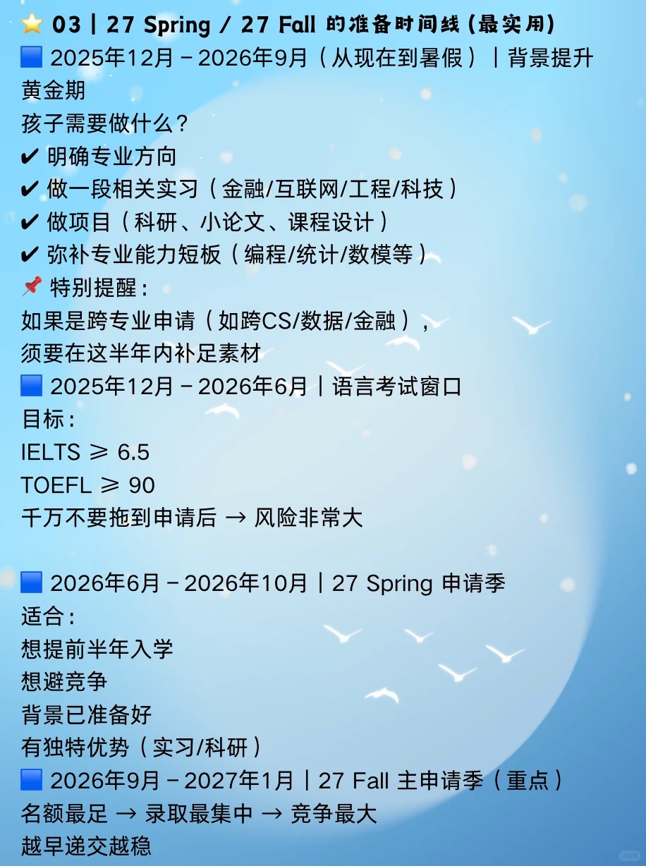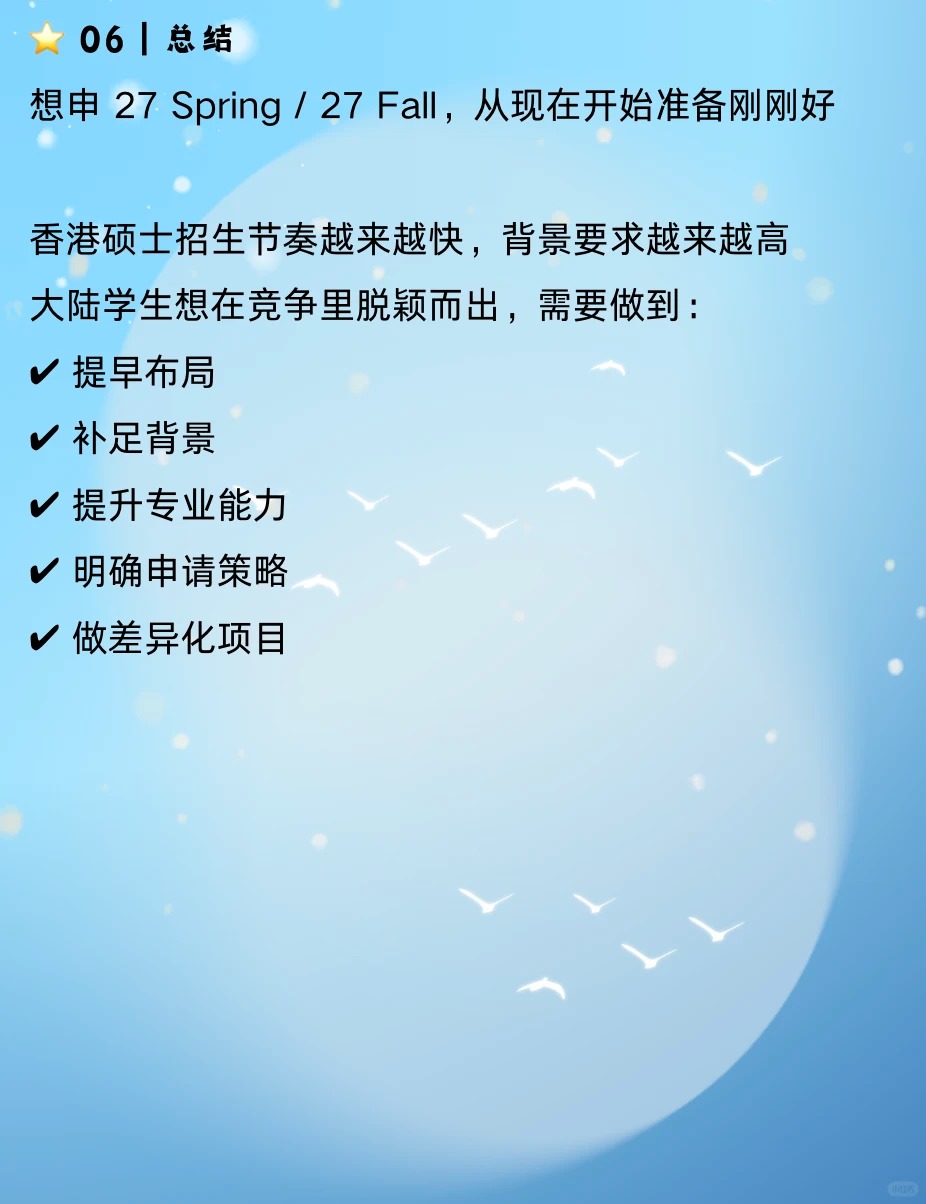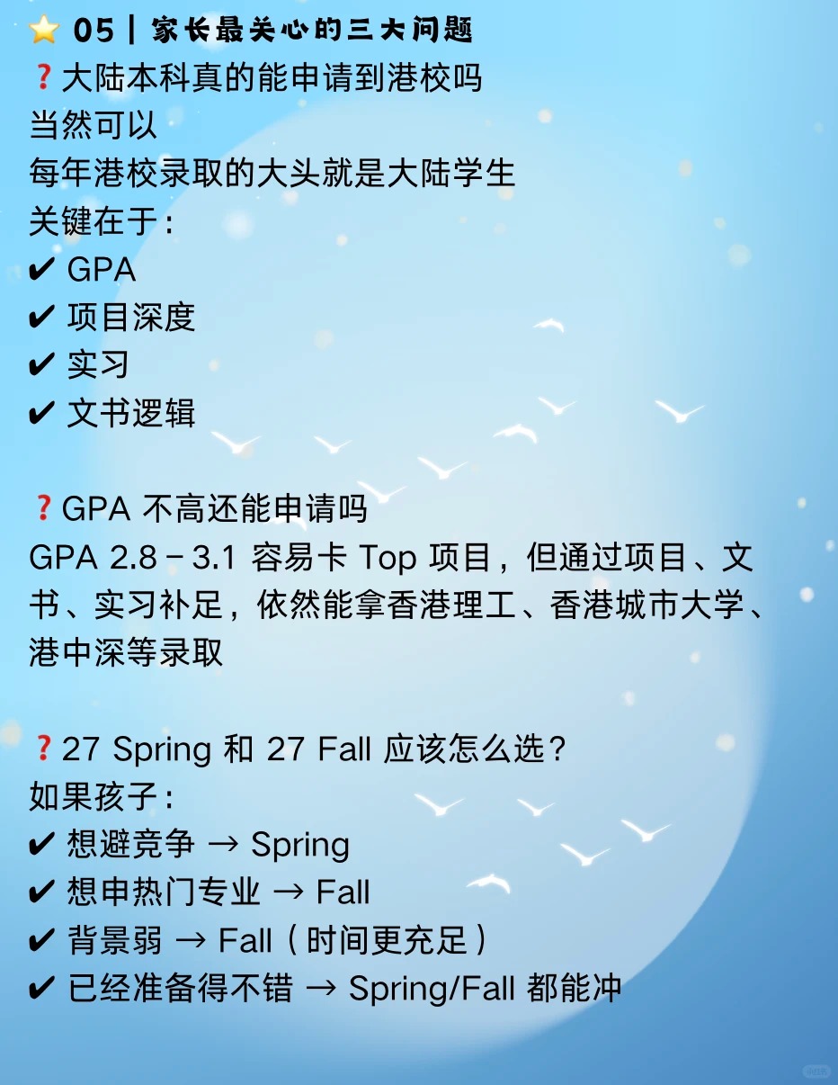 ?【27 Spring & 27 Fall 申请指南|香港硕士怎么准备?大陆本科的同学要提前准备什么?】 如果您打算让孩子申请香港硕士,请记住一句话: 香港硕士不是最后一年才准备,而是提前一年布局 错过准备时间=错过第一轮录取=录取质量大幅下降 ⭐ 01|香港硕士录取怎么“看人” 无论 27 Spring 还是 27 Fall,港校录取核心公式都一样 ✅GPA 3.0+稳,3.3+更有竞争力,3.5+进入优秀梯队 ✅英语 雅思6.5+或托福90+ ✅专业匹配度 本科修课、项目、技能是否对口 ✅经历(项目/科研/实习) 真正的分水岭在这里 港校越来越看重经历而不是分数 ⭐ 02|申请窗口|27 Spring vs 27 Fall 区别在哪 27spring 申请时间:26年6月–10月 适合人群: 想避开 Fall 激烈竞争 出分较晚 想提升录取质量 优势 ✔申请人数少,竞争性明显低 ✔适合跨专业、需要补背景的学生 27fall 申请时间:26年9月–27年1月 适合人群: 想冲更高等级项目 想申请更丰富的专业 优势 ✔项目多 ✔大部分商科/CS/工程/金融方向都开放 ⭐ 03|准备时间线 25年12月–26年9月|背景提升黄金期 ✔明确专业方向 ✔做一段相关实习 ✔弥补专业能力短板 ?特别提醒: 如果是跨专业申请,须要在这半年内补足素材 25年12月–26年6月|语言考试窗口 目标: 雅思≥6.5 托福≥90 ⭐ 04|不同专业应该怎么准备 ? 商科类 ✔一段以上商业类实习 ✔数据分析或商业分析项目 常见问题: ✘简历太空 ✘项目无深度 ✘文书过度同质化 ? 工科类 ✔校内项目 ✔科研/实验室 ✔编程能力 常见问题: ✘项目描述不到位 ✘没有专业深度 ⭐ 05|家长最关心的问题 ❓大陆本科真的能申请到港校吗 当然可以 每年港校录取的大头就是大陆学生 关键在于:GPA 项目深度 实习 文书逻辑 ❓GPA不高能申请吗 会卡项目,但通过科研、文书、实习补足, 依然能拿港理工、港城、港中深等录取 ❓27 Spring 和 27 Fall 应该怎么选 想避竞争→Spring 想申热门专业→Fall 背景弱→Fall(时间更充足) ⭐ 06|总结 想申27 Spring/27 Fall,从现在开始准备刚刚好 香港硕士招生节奏越来越快,背景要求越来越高 大陆学生想在竞争里脱颖而出,需要做到 提早布局 补足背景 提升专业能力 明确申请策略 做差异化项目