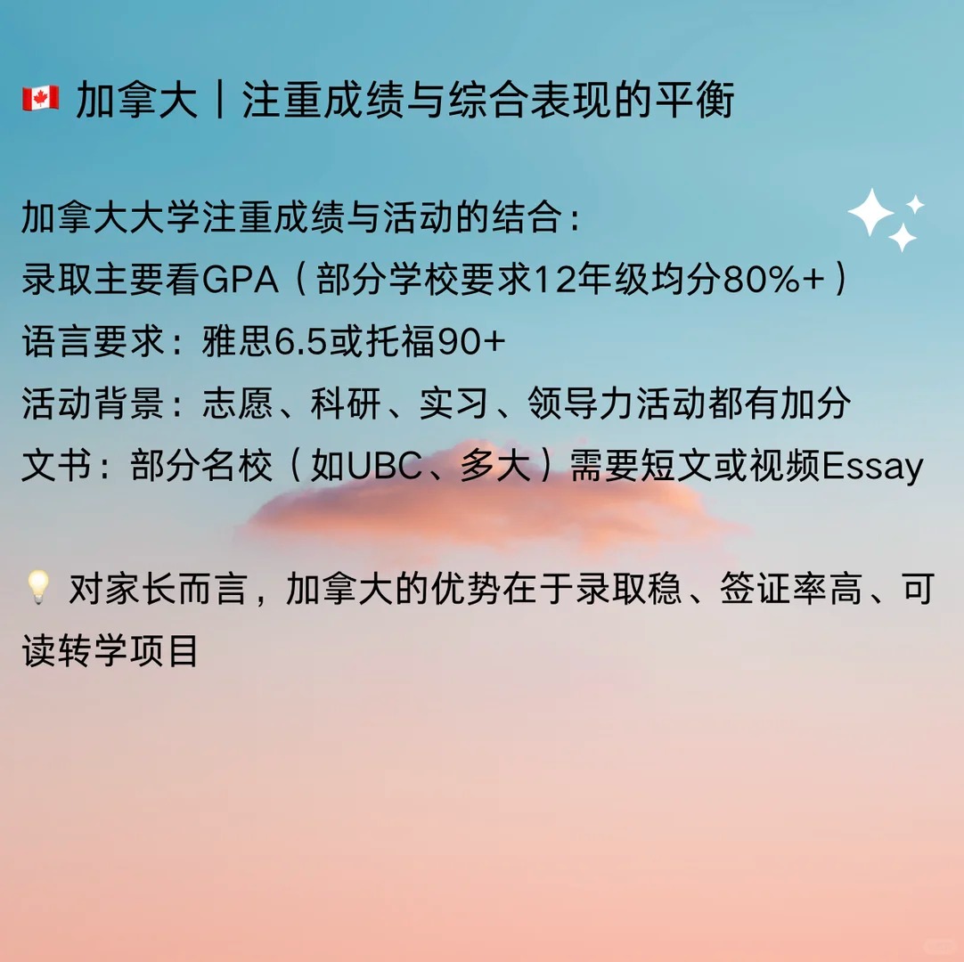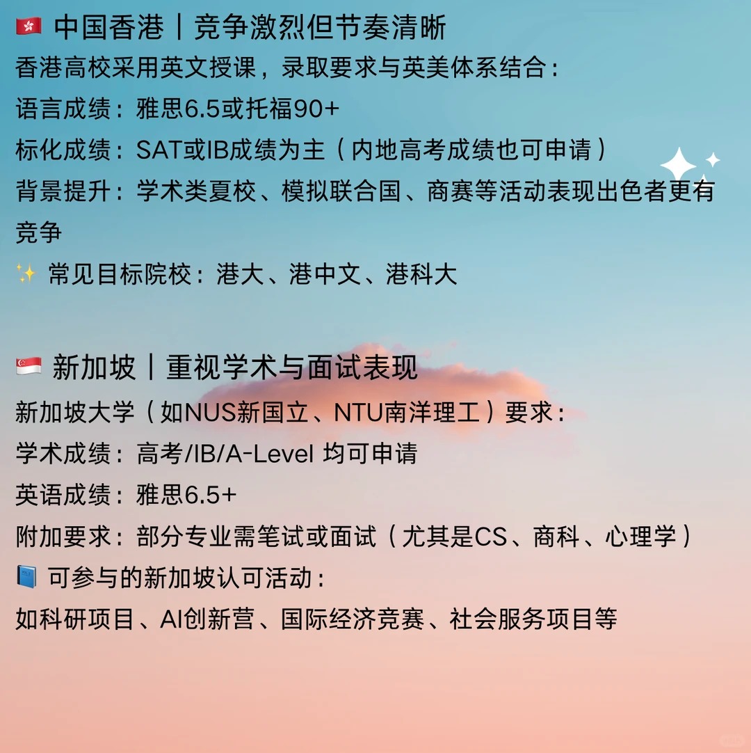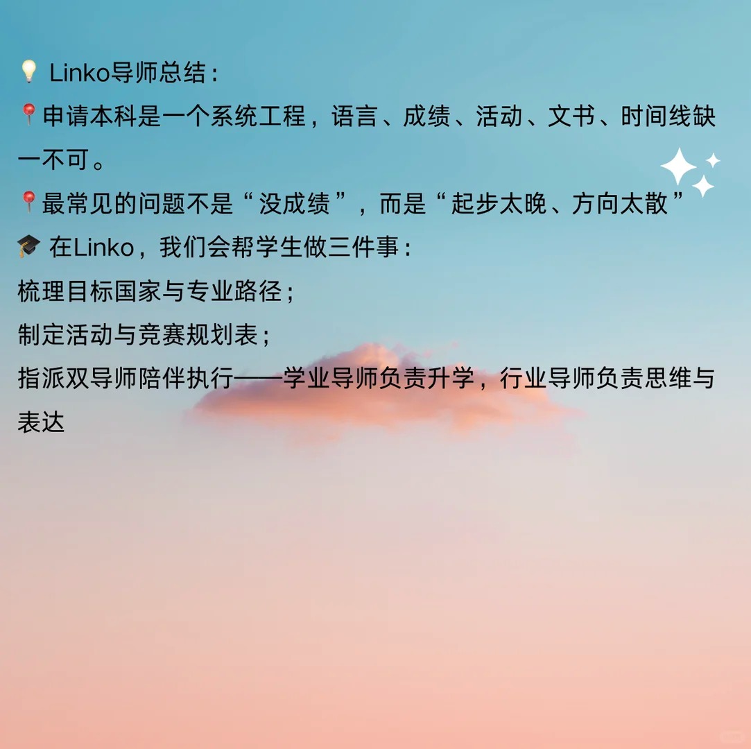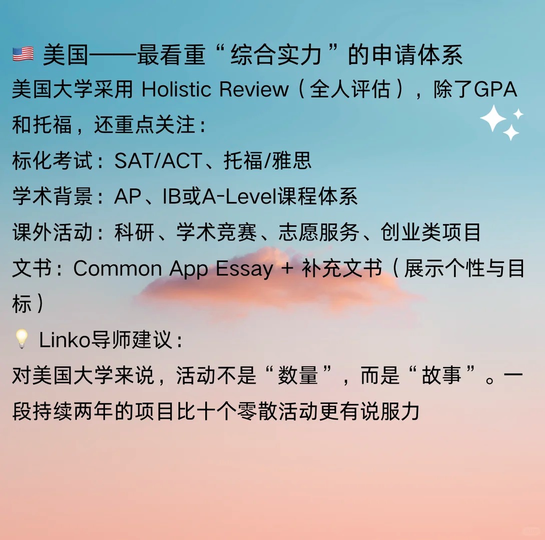 ?? 很多家长问我们: “孩子成绩不错,但到底要准备哪些活动和材料,才能申请海外本科?” “别人家孩子怎么都有一堆比赛和科研项目,我们该从哪里开始?” 其实,不同国家的本科申请体系差异很大,但有一个共同点: 不仅看分数,更看孩子的成长轨迹和潜力 今天,Linko就带你快速了解—— 申请美国、英国、加拿大、中国香港、新加坡本科分别要准备什么 美国|最看重“综合实力”的申请体系 美国大学采用全人评估,除了GPA和托福,还重点关注 标化考试:SAT/ACT、托福/雅思 学术背景:AP、IB、A-Level课程体系 课外活动:科研、学术竞赛、志愿服务 文书:Common App Essay + 补充文书 英国|更看重“学术导向”的申请体系 英国大学通过 UCAS 平台统一申请 学术成绩:A-Level、IB 或高中成绩 语言考试:雅思 学术兴趣文书 推荐信 常见活动:科研实训、学术论文、STEM/经济类竞赛 加拿大|注重成绩与综合表现的平衡 加拿大大学注重成绩与活动的结合: 录取主要看GPA 语言要求:雅思6.5或托福90+ 活动背景:志愿、科研、实习、领导力活动都有加分 文书:部分名校(如UBC、多大)需要短文或视频Essay 加拿大的优势在于录取稳、签证率高、可读转学项目 中国香港|竞争激烈但节奏清晰 香港高校采用英文授课,录取要求与英美体系结合 语言成绩:雅思6.5或托福90+ 标化成绩:SAT或IB成绩为主 背景提升:学术类夏校、模联、商赛等活动表现出色者更有竞争力 新加坡|重视学术与面试表现 学术成绩:高考/IB/A-Level 均可申请 英语成绩:雅思6.5+ 附加要求:部分专业需笔试或面试 可参与的新加坡认可活动: 如科研项目、AI创新营、国际经济竞赛、社会服务项目等 ? Linko导师总结 申请本科是一个系统工程,语言、成绩、活动、文书、时间线缺一不可 最常见的问题不是“没成绩”,而是“起步太晚、方向太散” ? 在Linko,我们会帮学生做三件事 1⃣梳理目标国家与专业路径 2⃣制定活动与竞赛规划表 3⃣指派双导师陪伴执行——学业导师负责升学,行业导师负责思维与表达